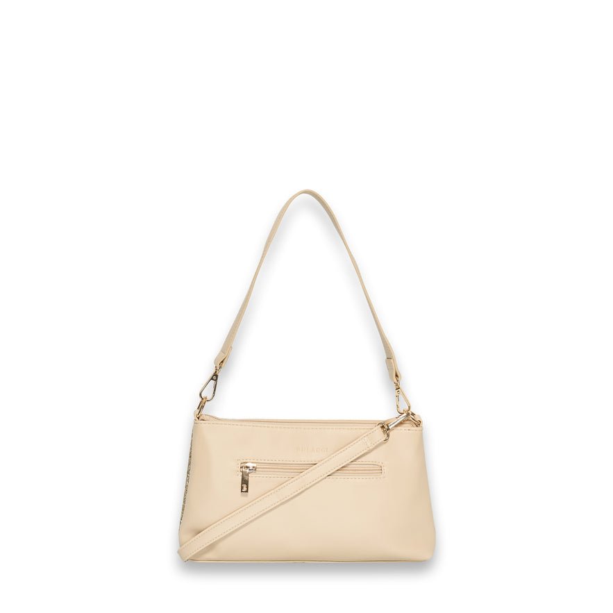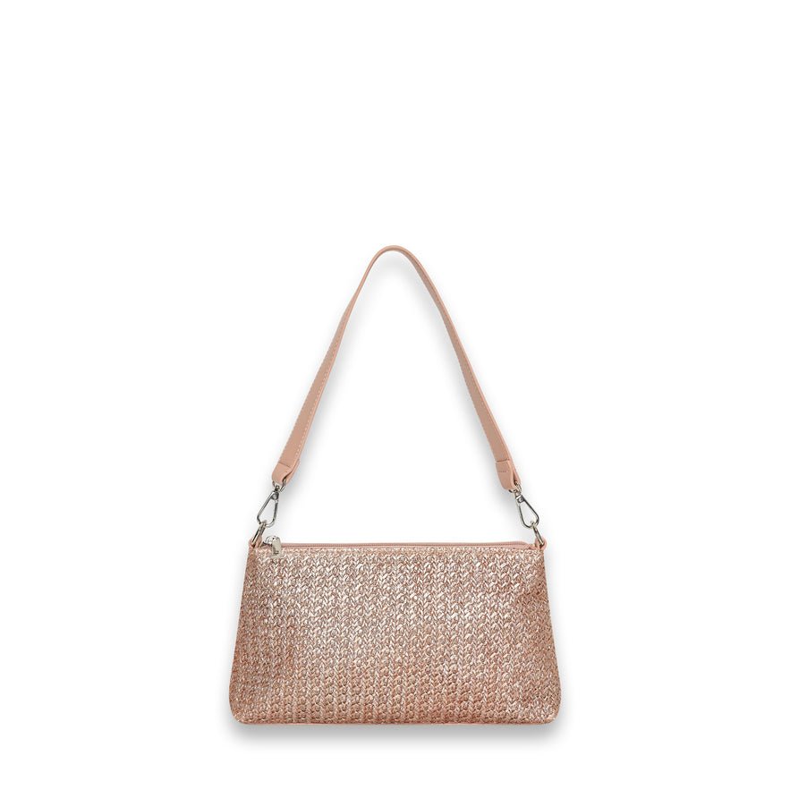 Deze stijlvolle schoudertas combineert elegantie met een speels, zomers karakter. De voorzijde is uitgevoerd in een verfijnde, gevlochten look met een subtiele glans, wat de tas een luxe en trendy uitstraling geeft. De strakke vorm en zachte kleur maken dit model perfect voor zowel overdag als ’s avonds.
