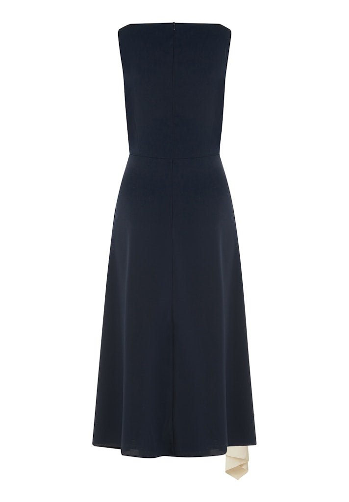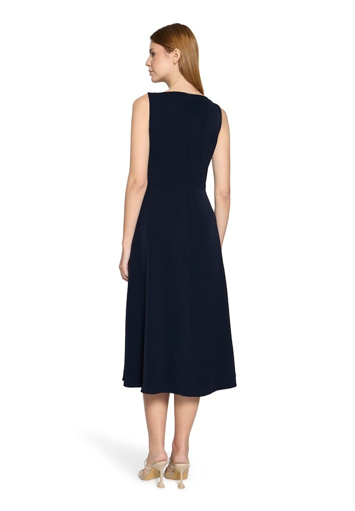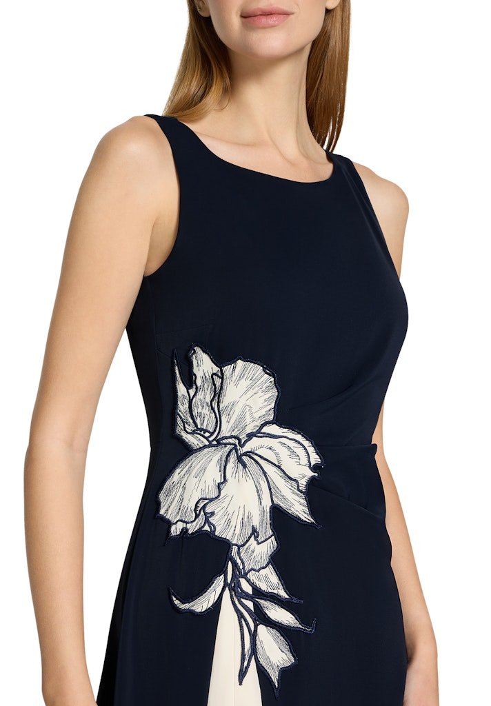 Deze verfijnde Vera Mont midi jurk straalt klasse en elegantie uit en is een perfecte keuze voor feestelijke gelegenheden, diners of formele events. De jurk is uitgevoerd in een diepe navy kleur en wordt prachtig geaccentueerd door een contrasterende off-white plissé inzet die sierlijk vanuit de taille naar beneden valt. Het subtiele bloemmotief met borduursel aan de zijkant geeft de jurk een exclusieve en vrouwelijke uitstraling.