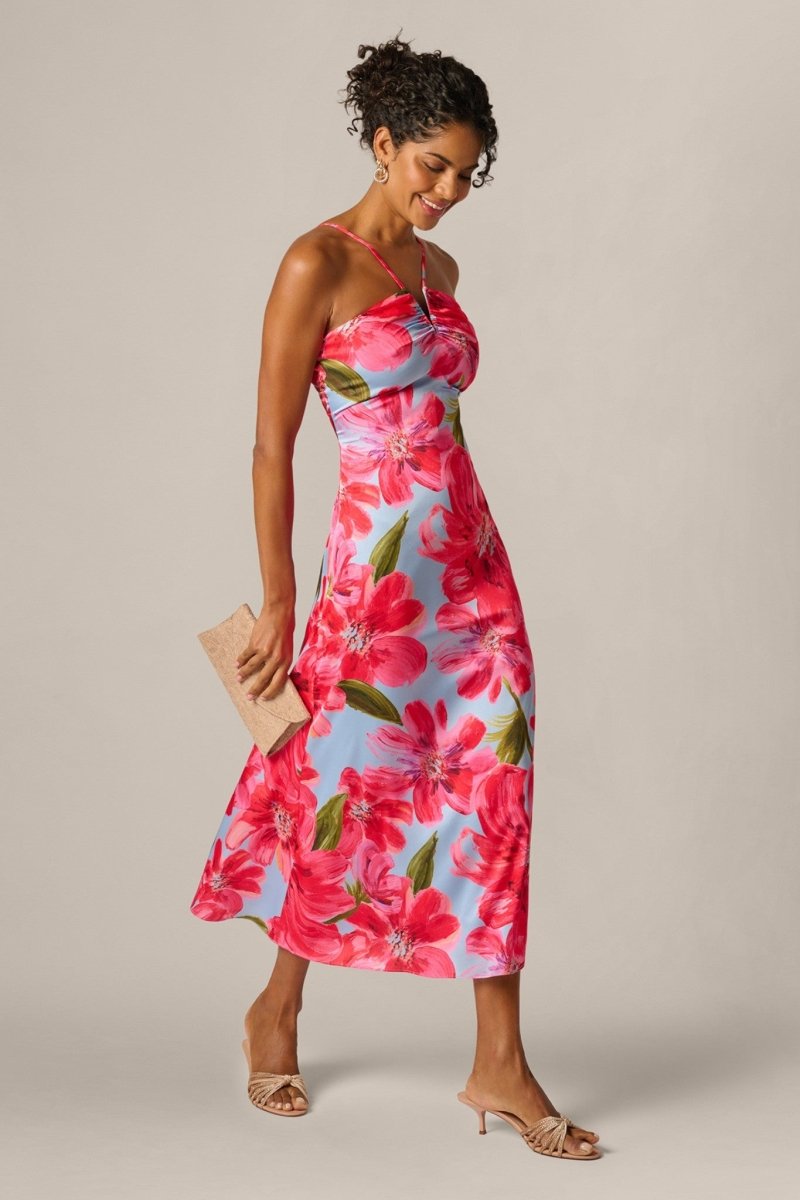 De halterhals met subtiele V-uitsnijding benadrukt mooi de schouders en halslijn en geeft de jurk een moderne, vrouwelijke touch. Het licht aangesloten silhouet volgt het lichaam op een flatterende manier en loopt soepel uit naar een elegante midi-lengte, waardoor de jurk zowel comfortabel als chic draagt.